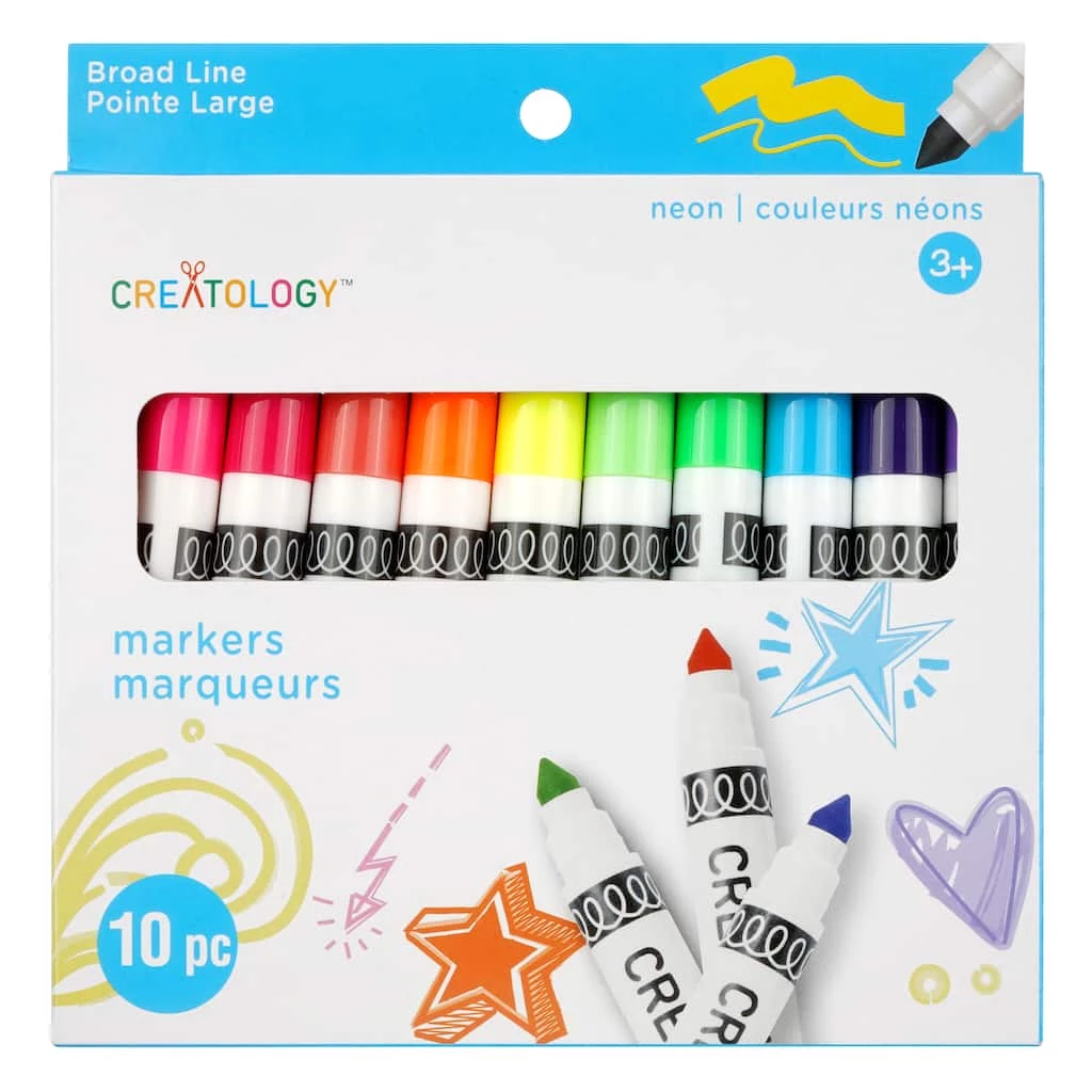 Draw and doodle designs with this neon marker set. This set of 10 markers are great for a variety of art and craft projects and an essential for classroom supplies. The colors included are: Neon Orange, Neon Green, Neon Yellow, Neon Yellow Green, Neon Magenta, Neon Pink, Neon Violet Red, Neon Tangerine, Neon Blue, and Neon Violet.