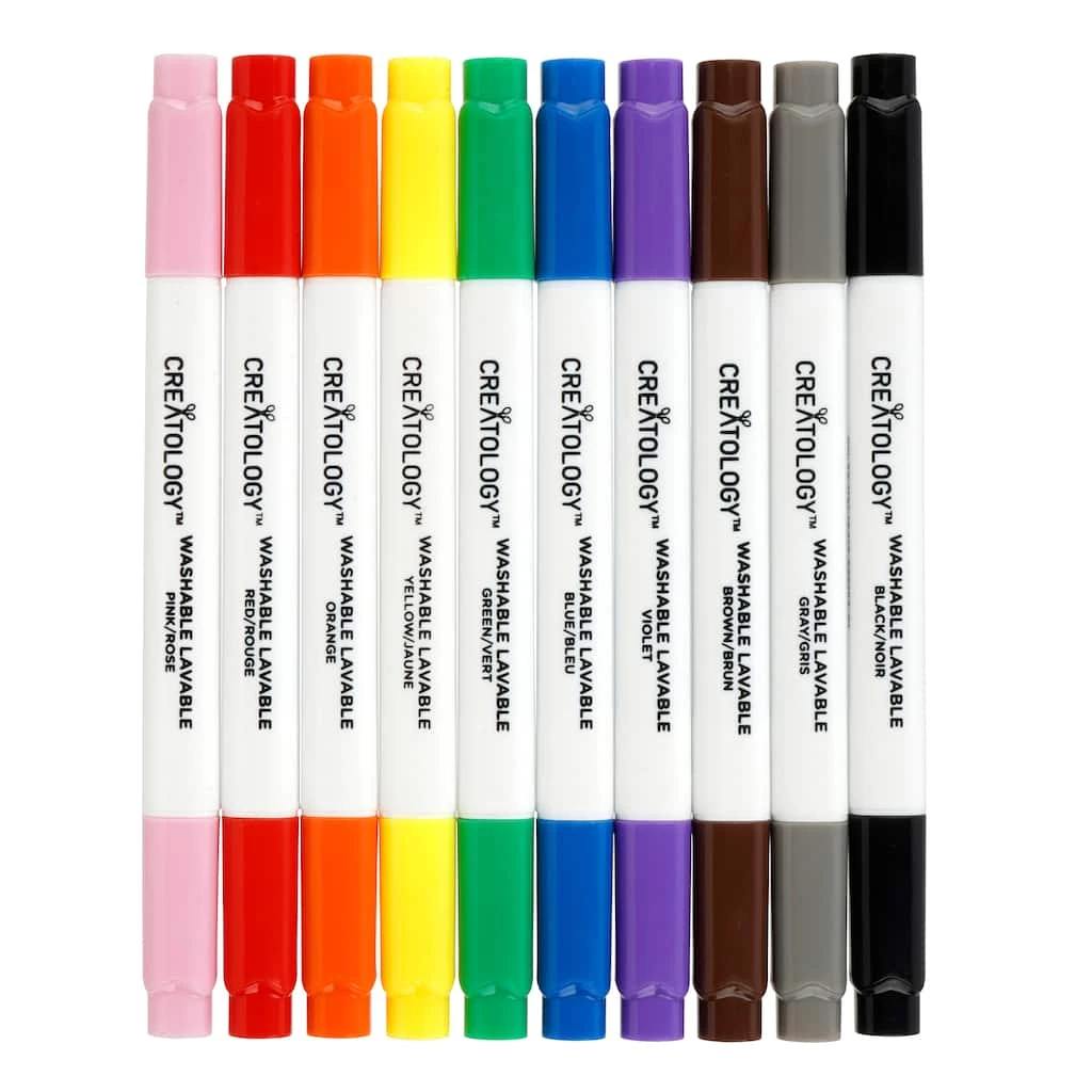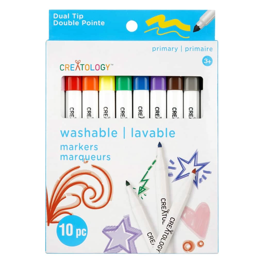 Draw and doodle designs with this washable marker set. This set of 10 dual tip markers are great for a variety of art and craft projects and an essential for classroom supplies. The colors included are: Black, Blue, Brown, Gray, Green, Orange, Pink, Red, Yellow, and Violet.