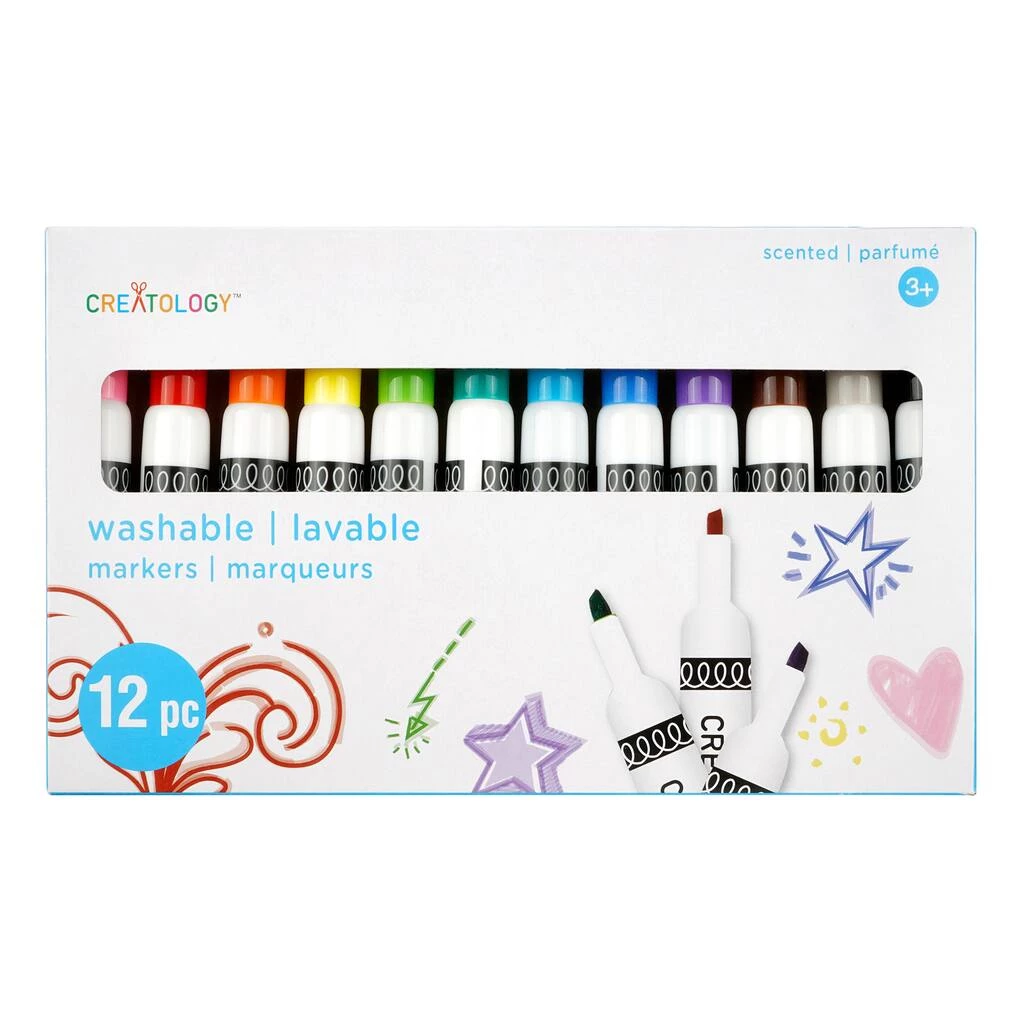 Draw and doodle designs with this washable marker set. This set of 12 scented markers are fun and great for a variety of art and craft projects. The colors included are: Black, Denim Blue, Orange, Sky Blue, Turquoise, Yellow, Pink, Red, Green, Violet, Brown, and Gray.