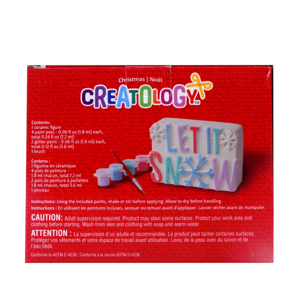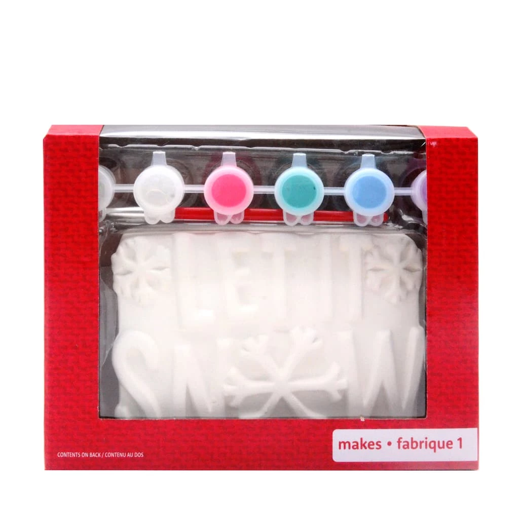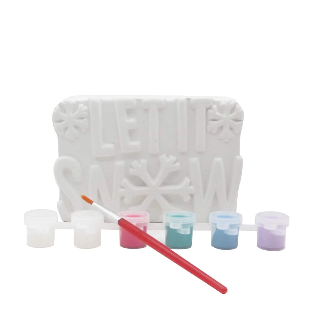 Bring in holiday cheer by painting this ceramic “Let it Snow” by Creatology. This kit includes all materials to transform the included piece into a holiday favorite.