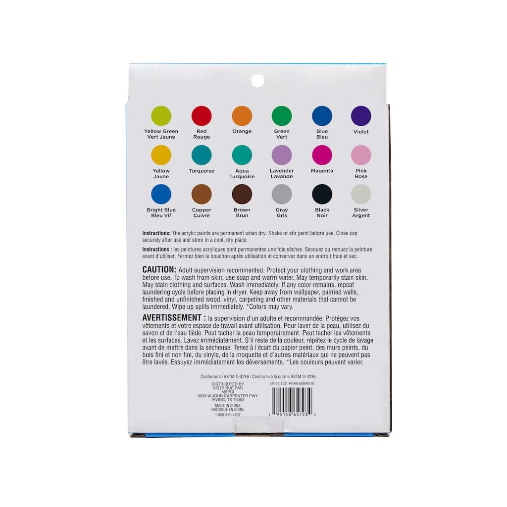 This metallic acrylic paint set is perfect for keeping your little ones creatively engaged. With a variety of primary hues to select, the possibilities are endless. Colors include: Yellow Green, Red, Orange, Green, Blue, Violet, Yellow, Turquoise, Aqua, Lavender, Magenta, Pink, Bright Blue, Copper, Brown, Gray, Black, and Silver.