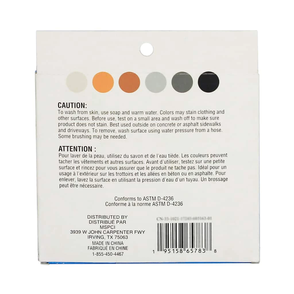 CAUTION: To wash from skin, use soap and warm water. Colors may stain clothing and other surfaces. Before use, test on a small area and wash off to make sure product does not stain. Best used outside on concrete or asphalt sidewalks and driveways. To remove, wash surface using water pressure from a hose. Some brushing may be needed.